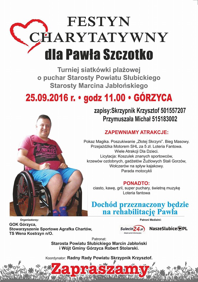 Cel jest szczytny, gdyż zbierane będą środki finansowe dla Pawła Szczotko ze Słońska, który jest byłym piłkarzem i absolwentem Zespołu Szkół Licealnych i Zawodowych w Sulęcinie. Paweł jest niepełnosprawny i potrzebuje fundusze na dalszą rehabilitację. Wpisowe do biegu wynosi minimum 10 zł, ale mile widziane będą wyższe. Uzyskane fundusze z wpisowego przeznaczone zostaną rehabilitację Pawła Oprócz biegu odbędzie się również festyn charytatywny, który zapewni nam wiele atrakcji |